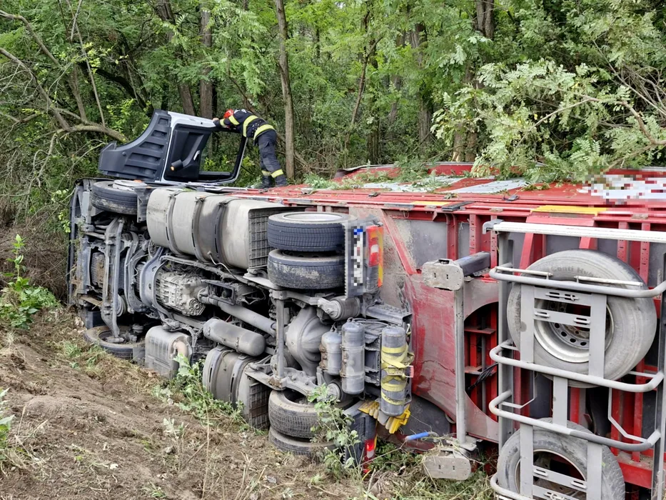GIURGIU: Autotren încărcat cu radiatoare, răsturnat pe DN5B. Scurgeri de carburant pe drum