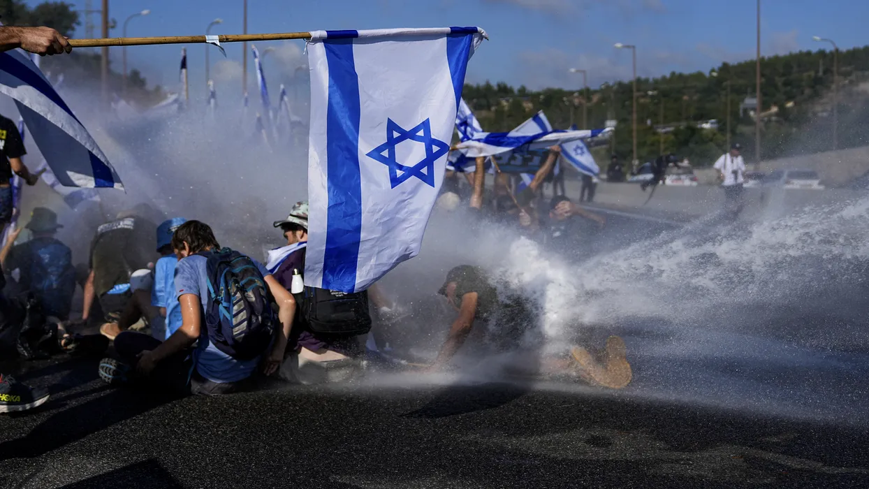 Israeli police use a water cannon to disperse demonstrators blocking a highway leading to Jerusalem during a protest against plans by Prime Minister Benjamin Netanyahu's new government to overhaul the judicial system, Tuesday, July 11, 2023. Israeli Prime Minister Benjamin Netanyahu's parliamentary coalition has given initial approval to a contentious bill to limit the Supreme Court's oversight powers. With the vote early Tuesday, Netanyahu pressed forward with a judicial overhaul plan that has polarized the country. (AP Photo/Ohad Zwigenberg)