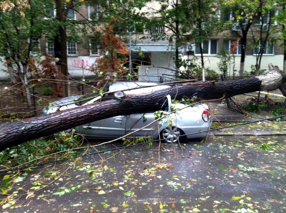 Haos în Capitală din cauza ploii: tramvaie și troleibuzele blocate, copaci căzuți peste mașini, trafic rutier îngreunat