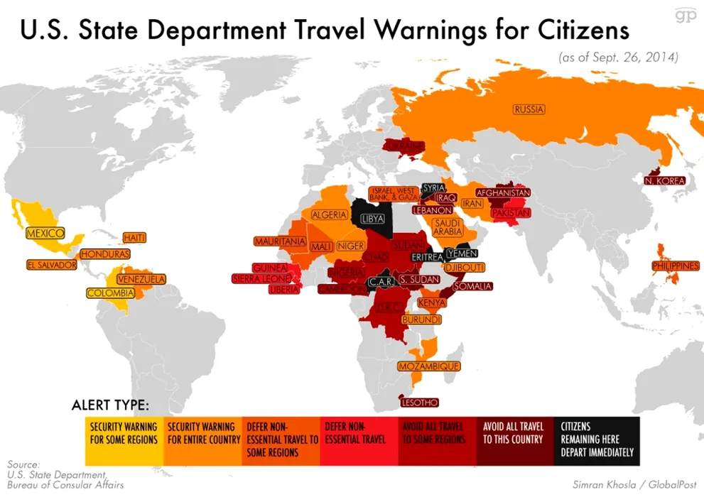 Harta celor mai periculoase regiuni din lume pentru călători, conform guvernului american. Unde se află România