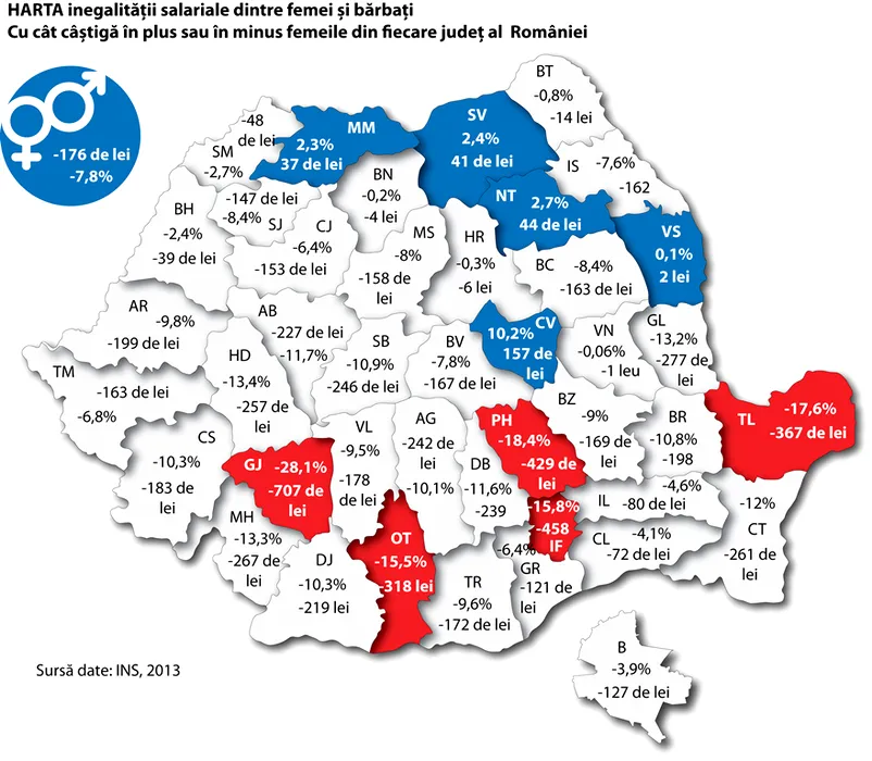 HARTA SALARIILOR din România. Județele în care femeile câștigă mai mult decât bărbații