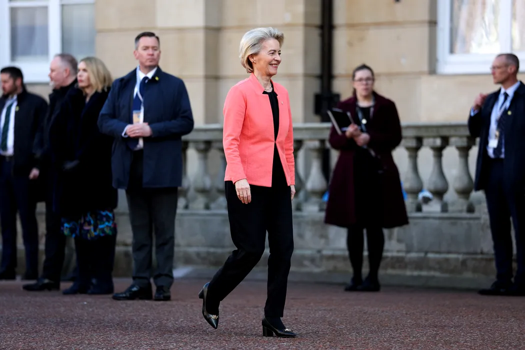 02 March 2025, United Kingdom, London: President of the European Commission Ursula von der Leyen arrives at Lancaster House for a summit meeting of European heads of state and government on the situation in Ukraine. Photo: Toby Melville/PA Wire/dpa