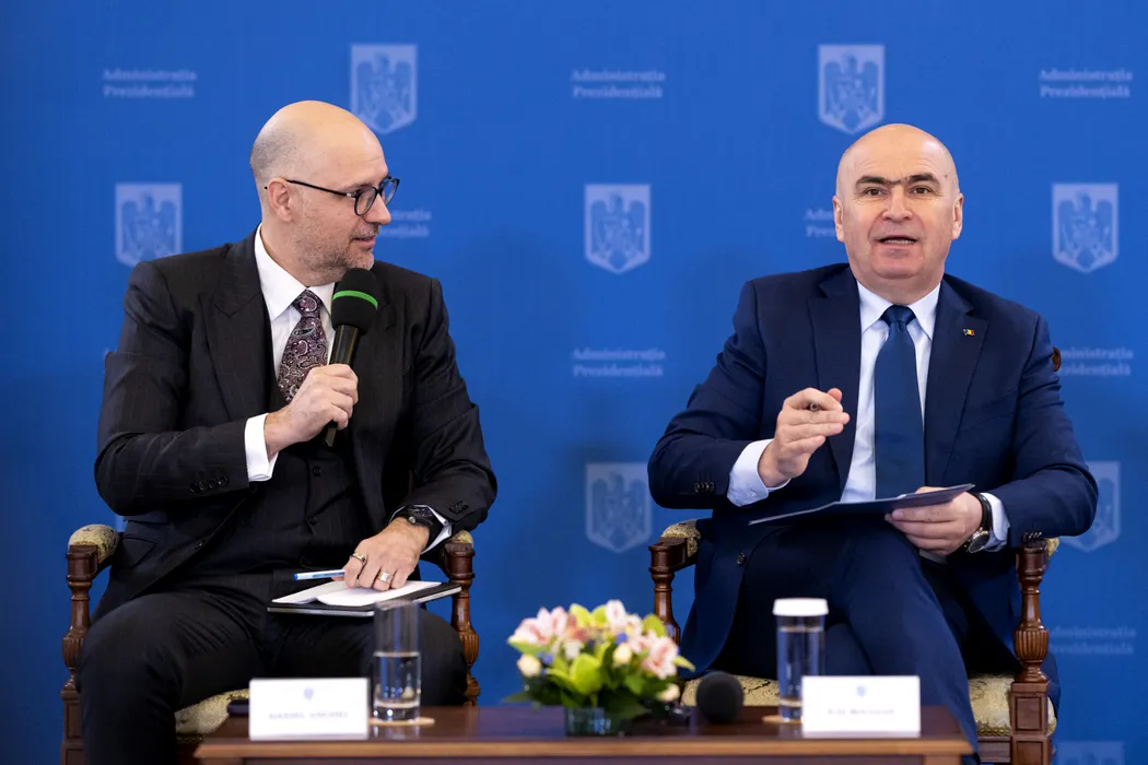 Presedintele interimar al Romaniei, Ilie Bolojan si Daniel Anghel, presedintele FIC, participa la evenimentul 'FIC CEOs: Romania pe harta investitiilor', organizat de Consiliul Investitorilor Straini, la Palatul Cotroceni, in Bucuresti, miercuri, 9 aprilie 2025. ALEXANDRU DOBRE / MEDIAFAX FOTO.