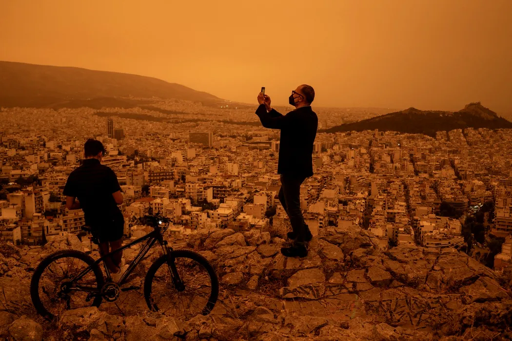 GALERIE FOTO: Imagini apocaliptice în Grecia. Cerul a devenit PORTOCALIU din cauza unui fenomen ciudat ce își are originea în deșertul Sahara