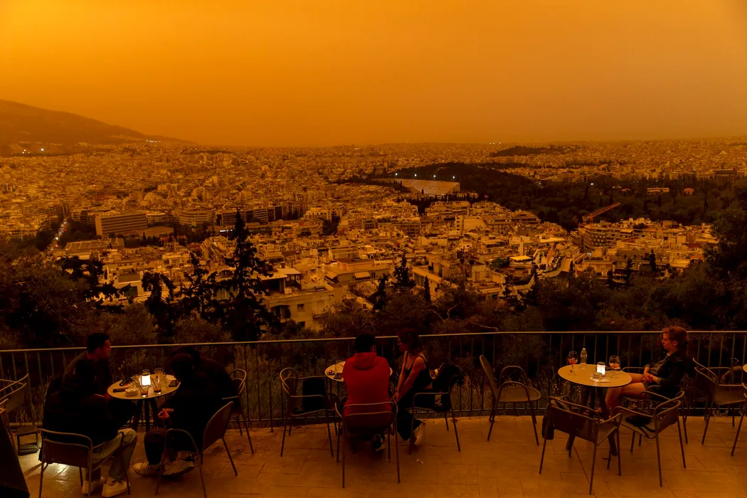GALERIE FOTO: Imagini apocaliptice în Grecia. Cerul a devenit PORTOCALIU din cauza unui fenomen ciudat ce își are originea în deșertul Sahara