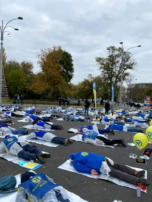 Imagini copleșitoare în Piaţa Victoriei! Medicii s-au întins pe asfalt pentru a le arăta autorităţilor că sunt epuizați și suprasolicitați Foto: Facebook Federatia Sanitara