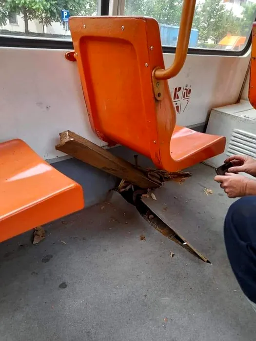 Imagini cu „Tramvaiul Groazei” care a fost străpuns de o șină și a rănit un călător. „Nu mai sunt electrozi de sudat liniile de o lună”