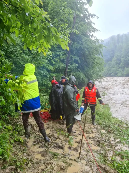 Imagini de la operațiunea de salvare a celor 12 muncitori din Vrancea, blocați de ape într-o zonă forestieră. Cum a decurs intervenția (VIDEO)