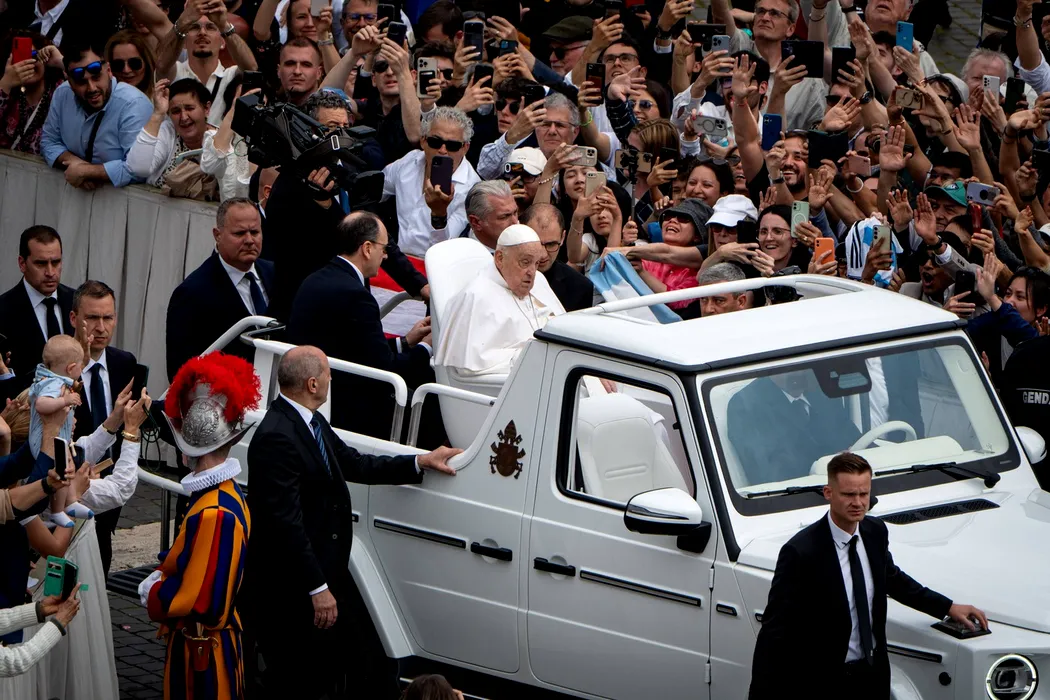 Pope Francis tours St. Peter's Square in his popemobile after bestowing the ‘Urbi et Orbi’ Blessing from the balcony of St. Peter's basilica overlooking St. Peter's Square in Vatican City. - Stefano Costantino / SOPA Images//SOPAIMAGES_SCOSTANTINO_25VAT2330/Credit:SOPA Images/SIPA/2504211211,Image: 990549825, License: Rights-managed, Restrictions: , Model Release: no