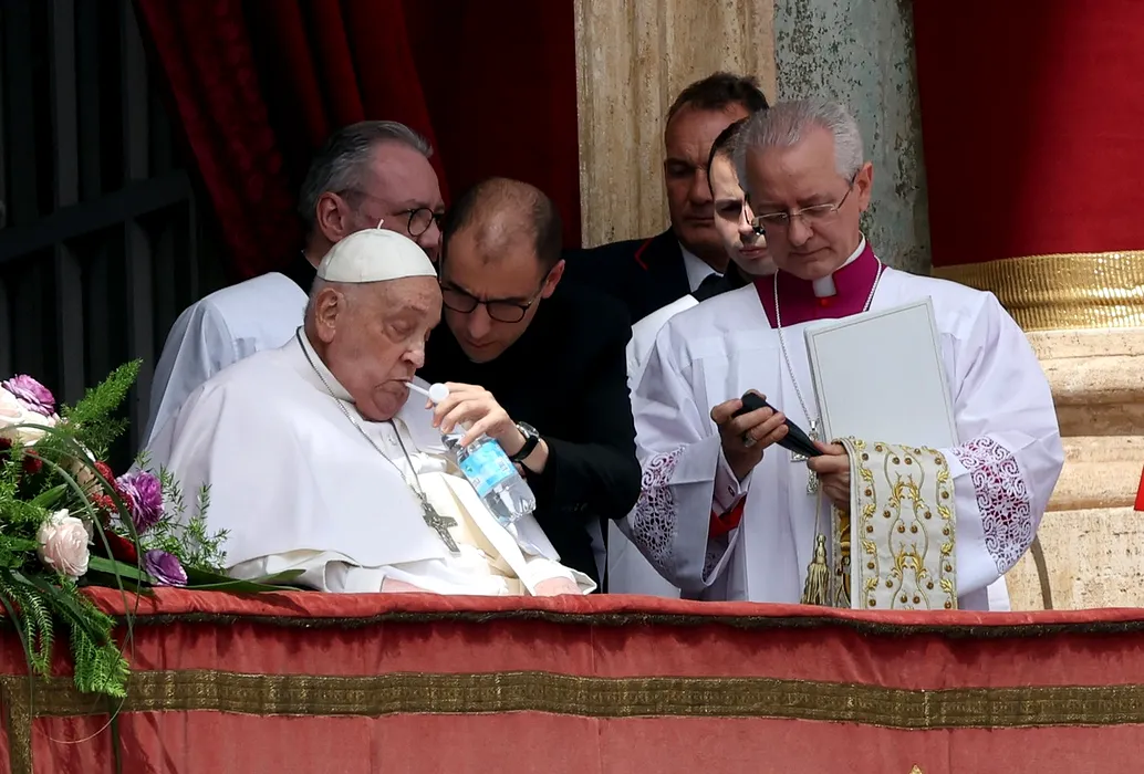 Vatican City , Italy 20.05.2025: Pope Francis looks out onto the central balcony drink water for Holy Mass on Easter Sunday and “Urbi et Orbi” Blessing in Saint Peter’s Square in Rome.,Image: 990261453, License: Rights-managed, Restrictions: Per la presente foto non č stata rilasciata liberatoria. Ai sensi di legge e come giŕ accettato in fase di registrazione sul sito, chi pubblica la foto č tenuto a pixelare tutto ciň che violi il Diritto alla Privacy di soggetti terzi (volti, targhe ecc.)., Model Release: no