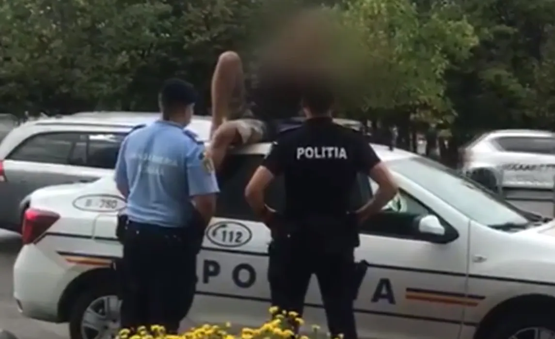 Imagini fabuloase cu un bărbat care s-a urcat pe mașina poliției, la Unirii, chiar de față cu agenții!