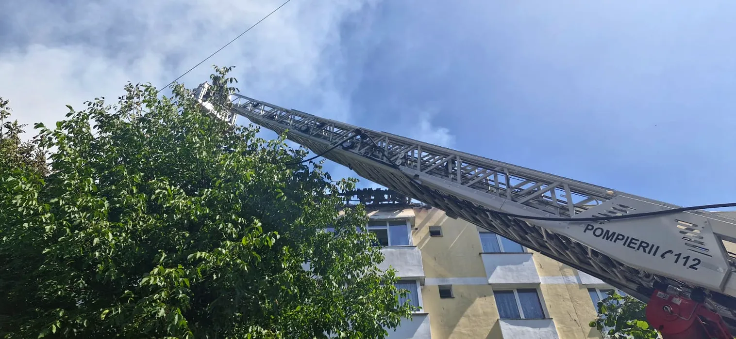 Imagini înfiorătoare cu un incendiu izbucnit la acoperișul unui bloc cu patru etaje din Piatra Neamț