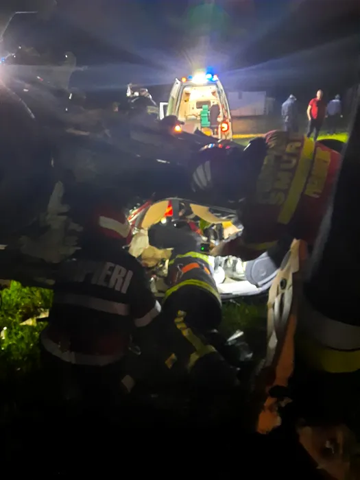 Câmpul pe care au sfârșit cei trei tineri aflați în mașina făcută ghem este plin de bucăți din autoturism