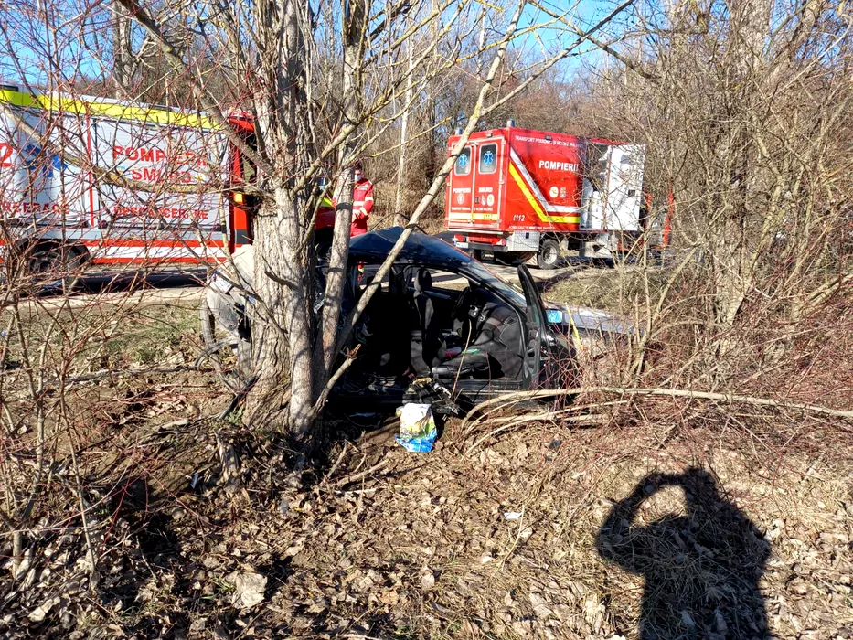 Imagini șocante în Sibiu! Cum arată un BMW după ce șoferul a pierdut controlul mașinii și s-a izbit de un copac! GALERIE FOTO