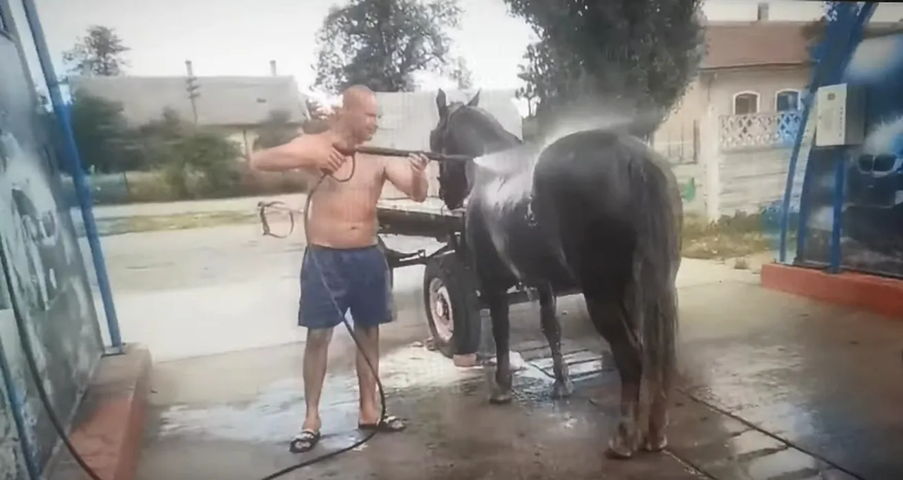 Imagini virale: Un bărbat din Timiș și-a răcorit calul la o spălătorie auto