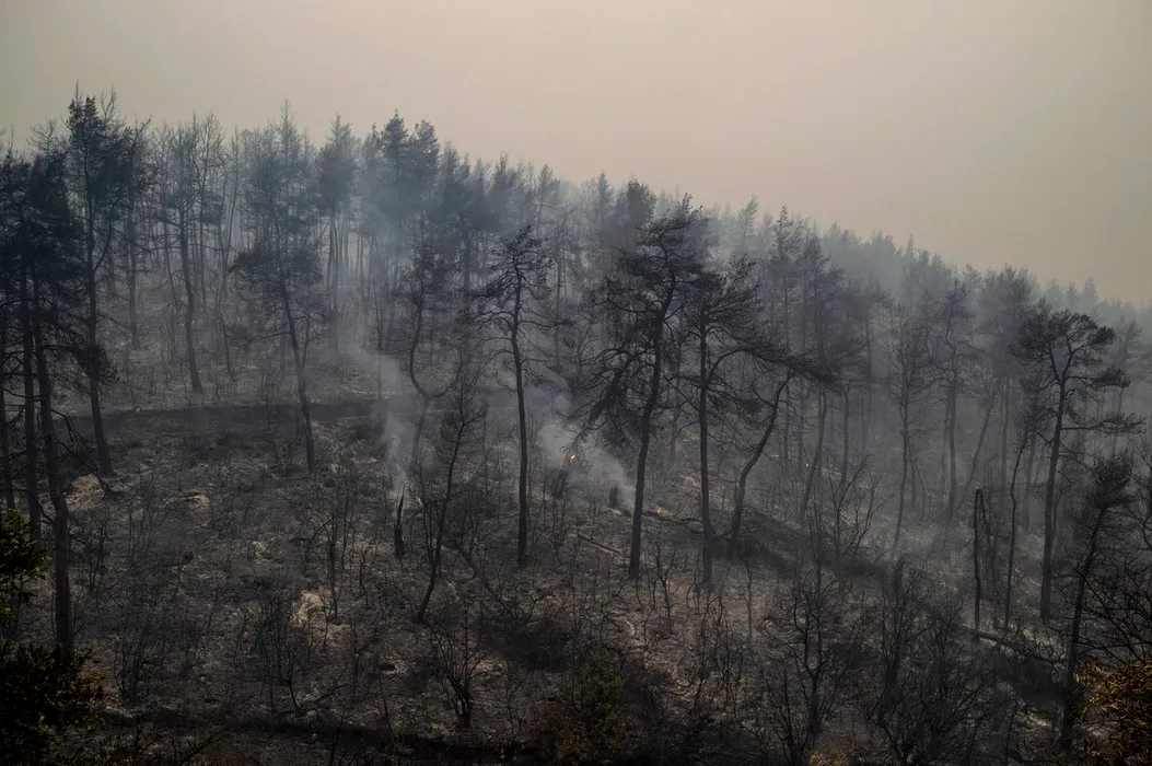 This picture taken on August 9, 2021 shows burnt trees trunk during a wildfire at the village of Pefki on Evia (Euboea) island, Greece's second largest island. Hundreds of Greek firefighters fought desperately on August 8, 2021 to control wildfires on the island of Evia that have charred vast areas of pine forest, destroyed homes and forced tourists and locals to flee.,Image: 626176772, License: Rights-managed, Restrictions: , Model Release: no, Credit line: Profimedia
