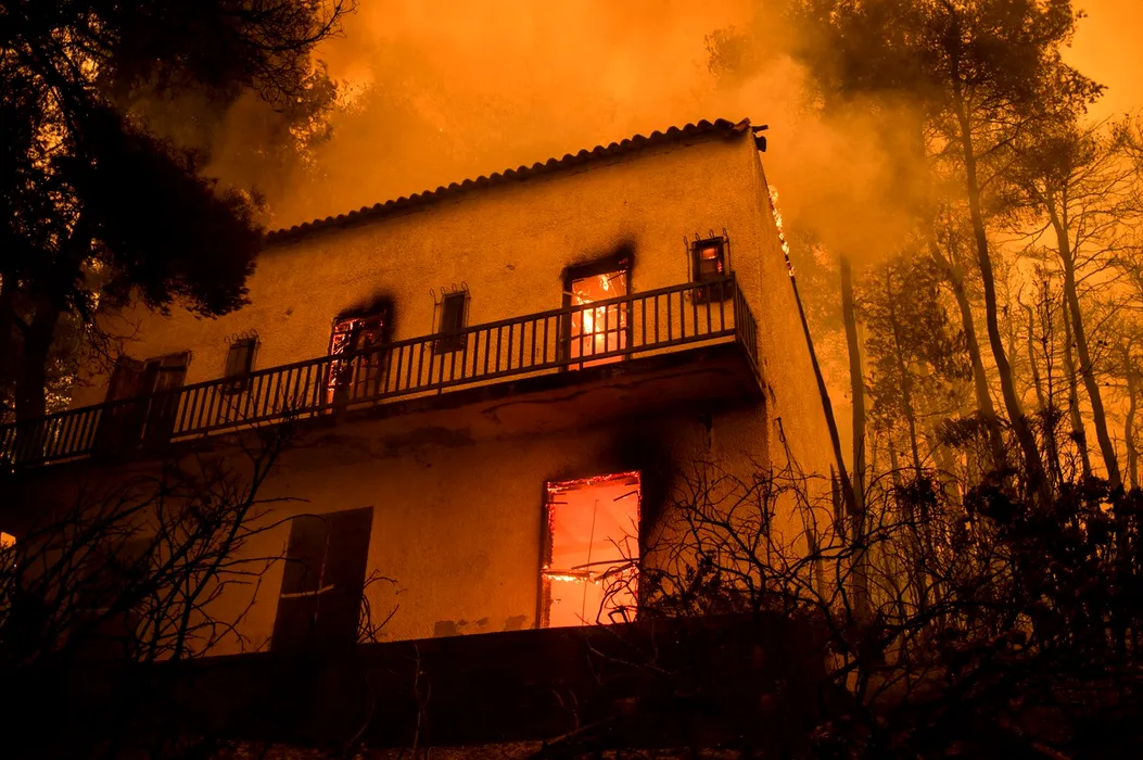 A house is burning during an attempt to extinguish forest fires approaching the village of Pefki on Evia (Euboea) island, Greece's second largest island, on August 8, 2021. Hundreds of Greek firefighters fought desperately on August 8 to control wildfires on the island of Evia that have charred vast areas of pine forest, destroyed homes and forced tourists and locals to flee. Greece and Turkey have been battling devastating fires for nearly two weeks as the region suffered its worst heatwave in decades, which experts have linked to climate change.,Image: 626106488, License: Rights-managed, Restrictions: , Model Release: no, Credit line: Profimedia