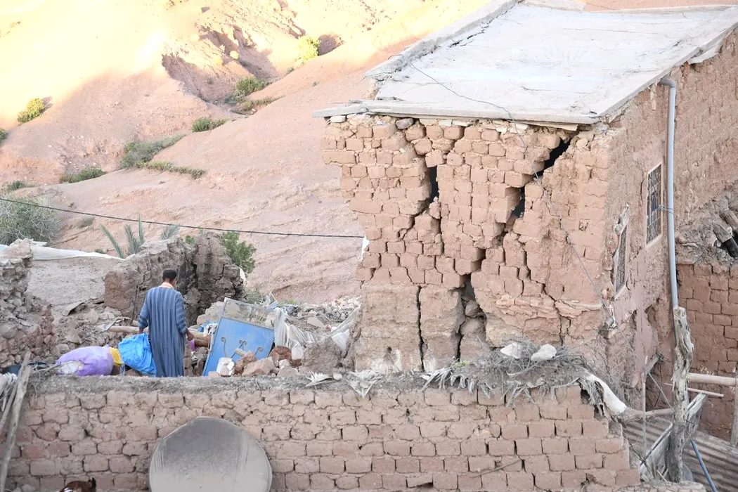 MARRAKESH, Sept. 10, 2023 -- A man walks among the rubble of a damaged building after a 6.8-magnitude earthquake in Tahannaout, Morocco on Sept. 9, 2023. A 6.8-magnitude earthquake hit Morocco Friday at 11:11 p.m. local time (2211 GMT) at a depth of 18.5 km, said the United States Geological Survey. The epicenter of the earthquake was near the town of Ighil in Al Haouz Province, some 70 km southwest of Marrakesh.