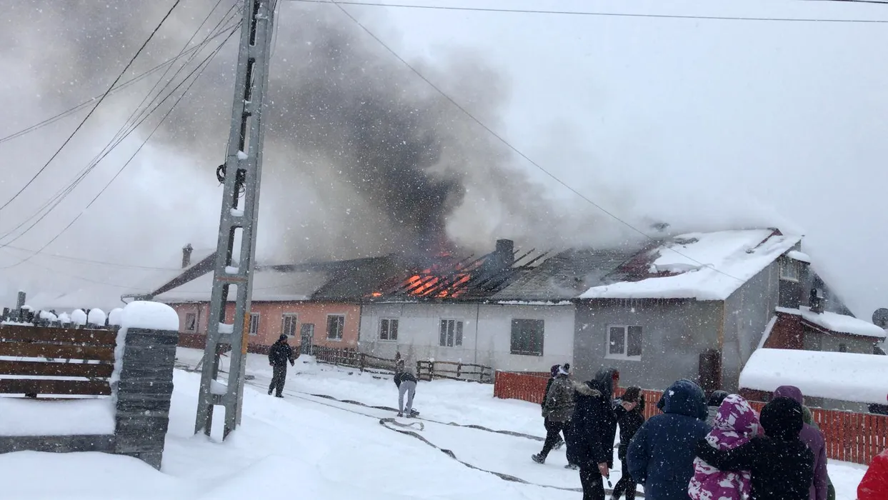 Incendiu de proporții în Covasna. Opt case lipite între ele, distruse de flăcări. Imagini de la fața locului