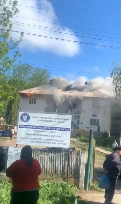 Panică la sediul unei primării din Dolj: A luat foc acoperișul clădirii, iar planșeul de la etajul 1 s-a PRĂBUȘIT / ISU: „Nu sunt victime”