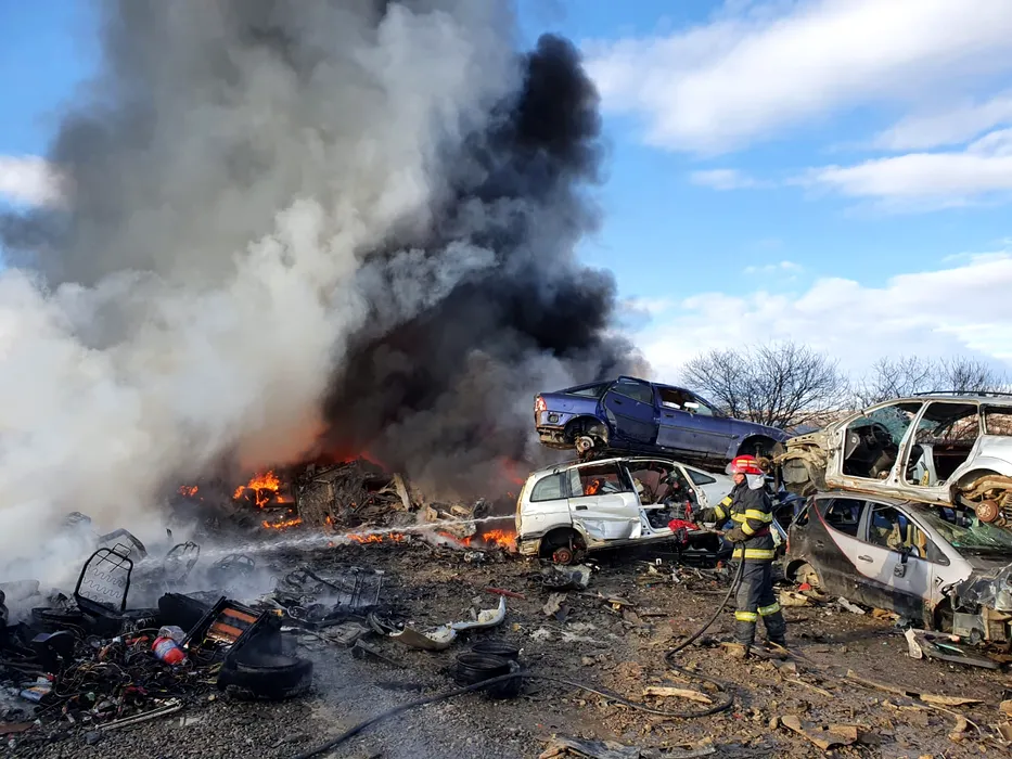 Incendiu la un depozit de mașini uzate din Neamț. Au ars 30 de autoturisme și un camion