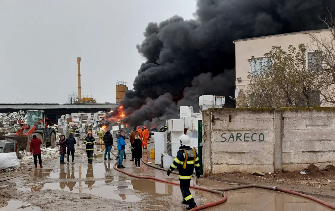 Incendiu puternic la un depozit de materiale reciclabile din Popești-Leordeni: Au ars 3.000 de metri pătrați. Garda de Mediu: Sunt depăşiri mari la monoxid şi dioxid de carbon