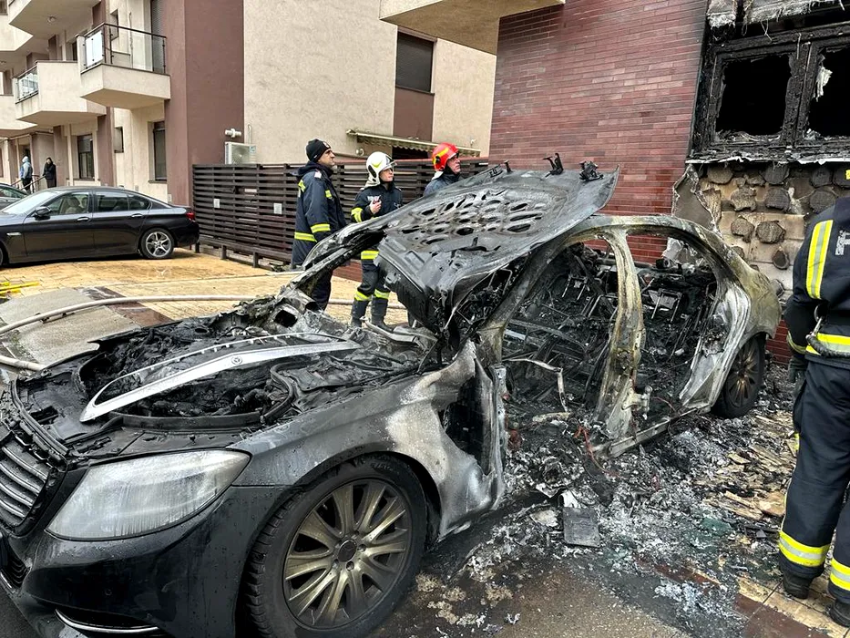 GALERIE FOTO: UPDATE: FOTO-VIDEO – Incendiu puternic într-un cartier exclusivist al Capitalei. Un Mercedes a luat foc, iar flăcările s-au extins la o altă mașină și la un bloc / Ultima revizie a fost făcută acum trei zile / Mașina a fost cumpărată de la finul lui Remus Truică în august