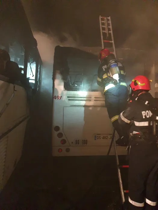 INCENDIU. Trei autobuze mistuite de flăcări în Dâmbovița. Autoritățile cred că focul a fost pus intenționat