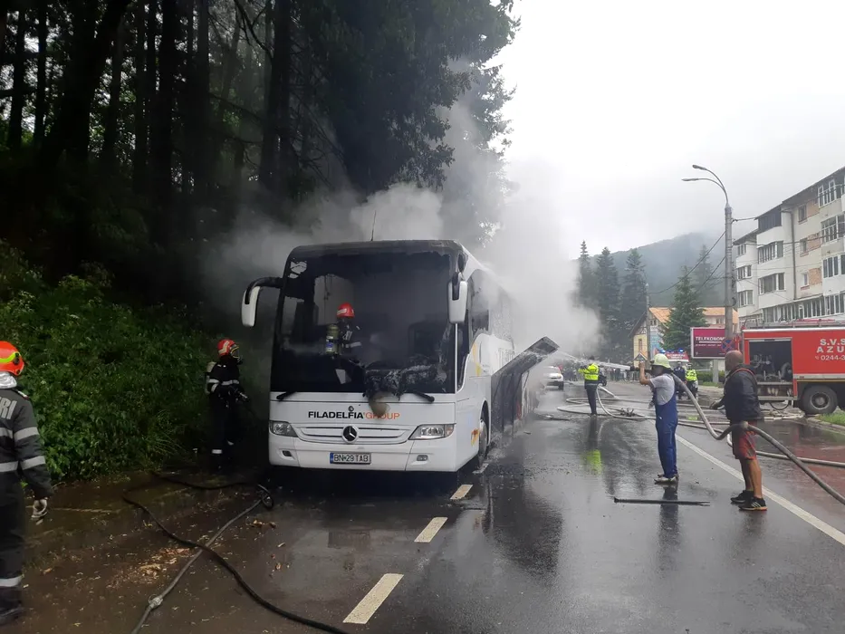 INCENDIU. Un autocar cu 46 de persoane la bord a luat foc pe DN1, în Azuga | Traficul în zonă a fost reluat