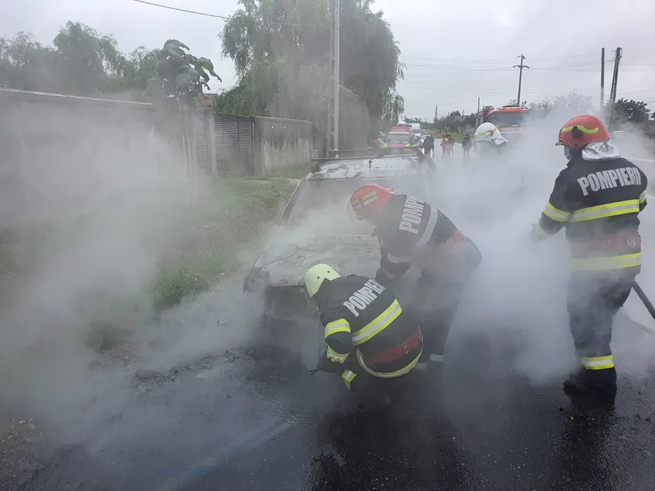 INCENDIU. Un autoturism a luat foc în timpul mersului, pe DN64. Autoritățile au intervenit la fața locului