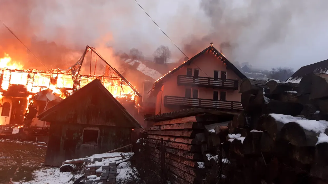 Incendiu uriaș la o pensiune din Moieciu de Sus. Flăcările s-au extins la alte două clădiri – VIDEO