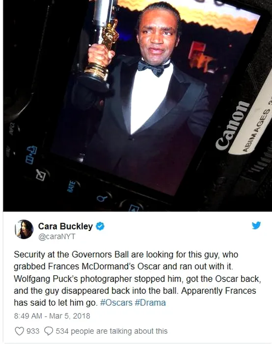 Incident bizar după gala Oscarurilor. Nimeni nu știe cine este acest bărbat și de ce a încercat să-i fure statueta lui Frances McDormand