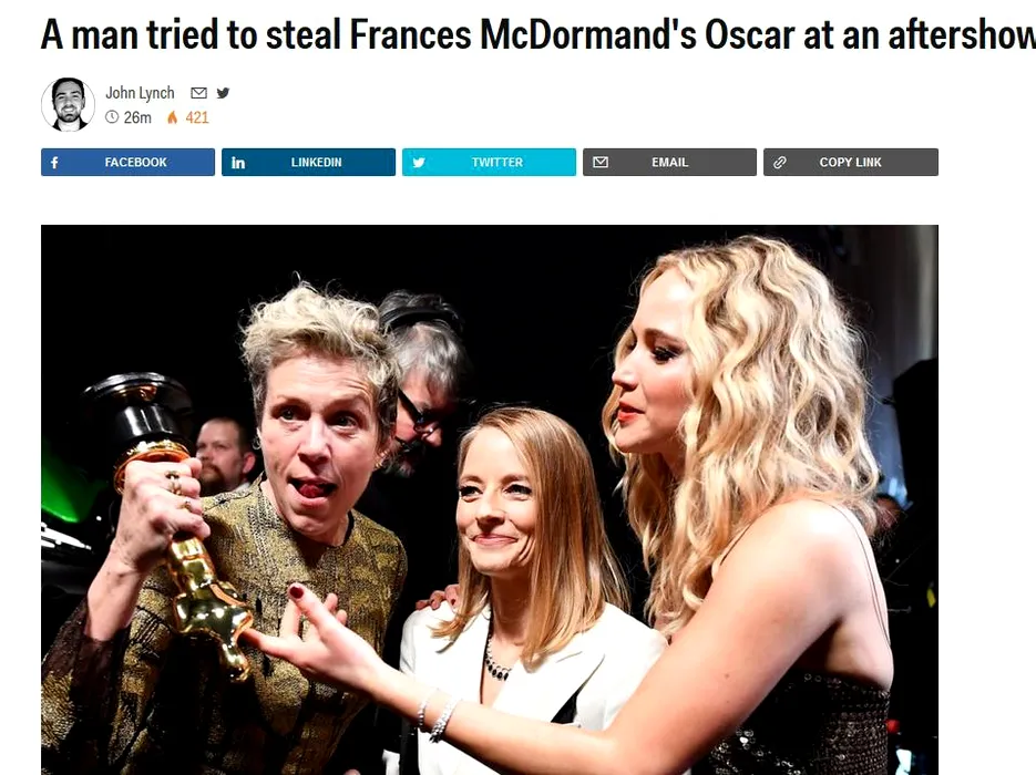 Incident bizar după gala Oscarurilor. Nimeni nu știe cine este acest bărbat și de ce a încercat să-i fure statueta lui Frances McDormand