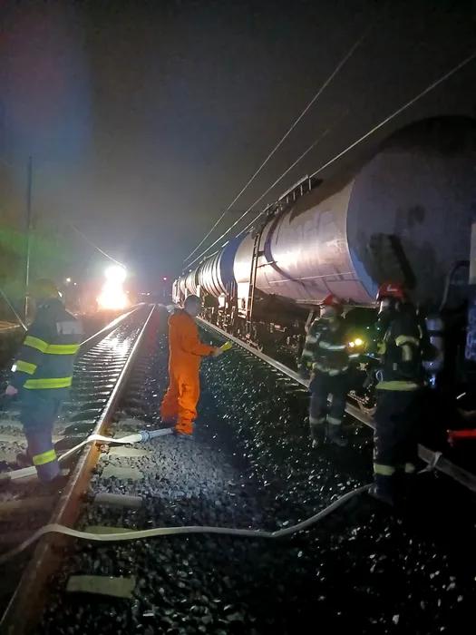 Intervenţia pompierilor, într-o gară din Mureș, FINALIZATĂ după aproape șase ore. Scurgeri de carburant dintr-un vagon cisternă al unui tren de marfă