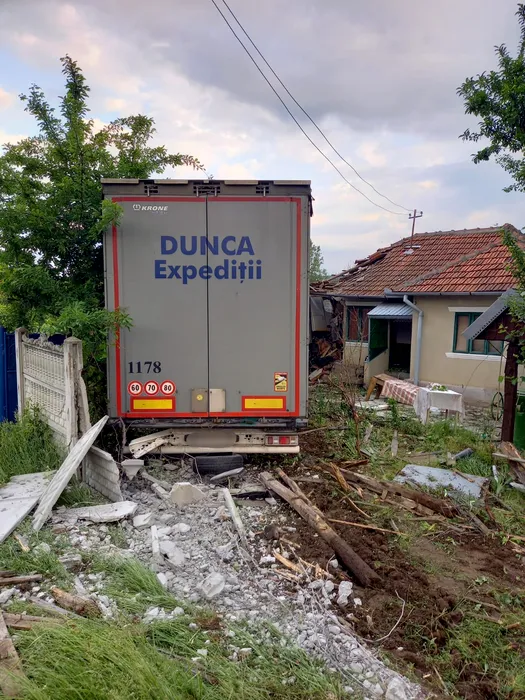 Incident în Mehedinți. Un TIR a părăsit șoseaua și a intrat într-o casă (GALERIE FOTO)