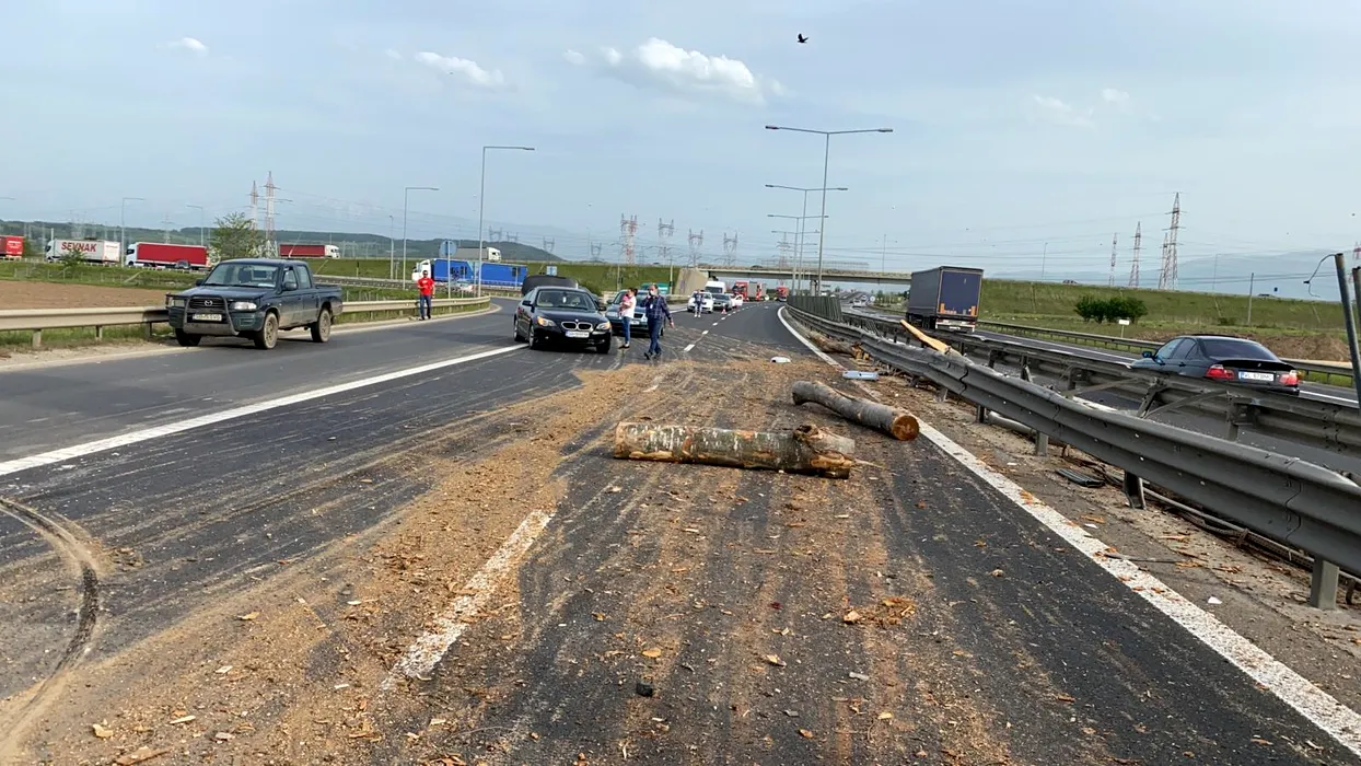 AUTOSTRADA 1. Un camion plin cu lemne a pierdut o parte din încărcătură între Sibiu și Orăștie