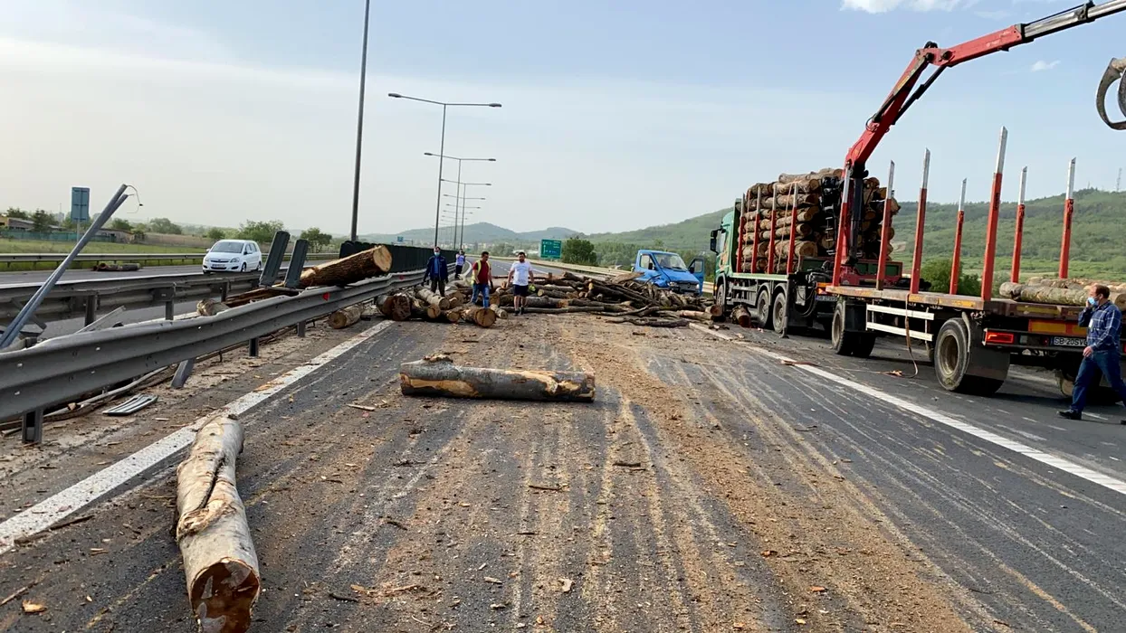 AUTOSTRADA 1. Un camion plin cu lemne a pierdut o parte din încărcătură între Sibiu și Orăștie