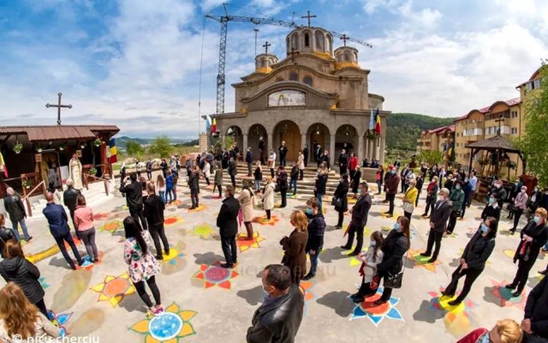 Soluția găsită de un preot din Cluj pentru ca toți cei care vin la biserică să respecte distanțarea socială. 150 de flori desenate pe asfalt alături de voluntari: „Așa cum spunea Constantin Noica, noi trebuie să trăim ca albinele pe pământ, nu ca muștele” / Sursă FOTO: Nicu Cherciu - Facebook