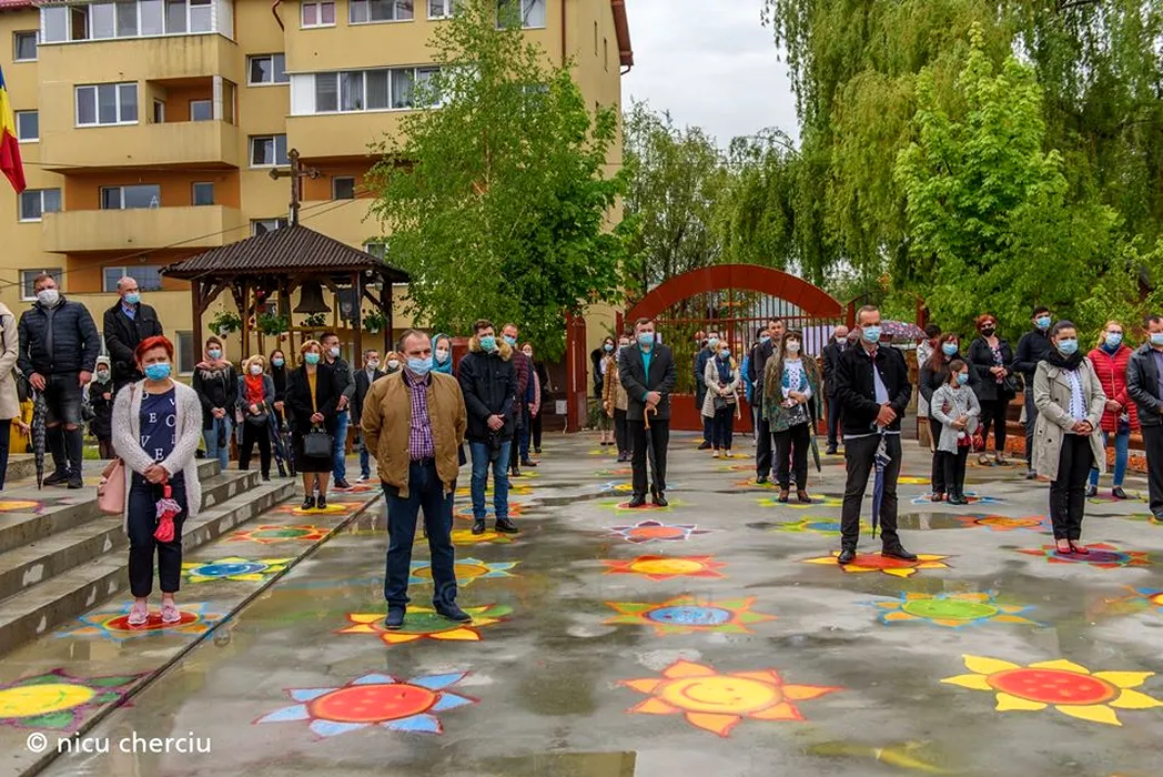 Soluția găsită de un preot din Cluj pentru ca toți cei care vin la biserică să respecte distanțarea socială. 150 de flori desenate pe asfalt alături de voluntari: „Așa cum spunea Constantin Noica, noi trebuie să trăim ca albinele pe pământ, nu ca muștele” / Sursă FOTO: Nicu Cherciu - Facebook