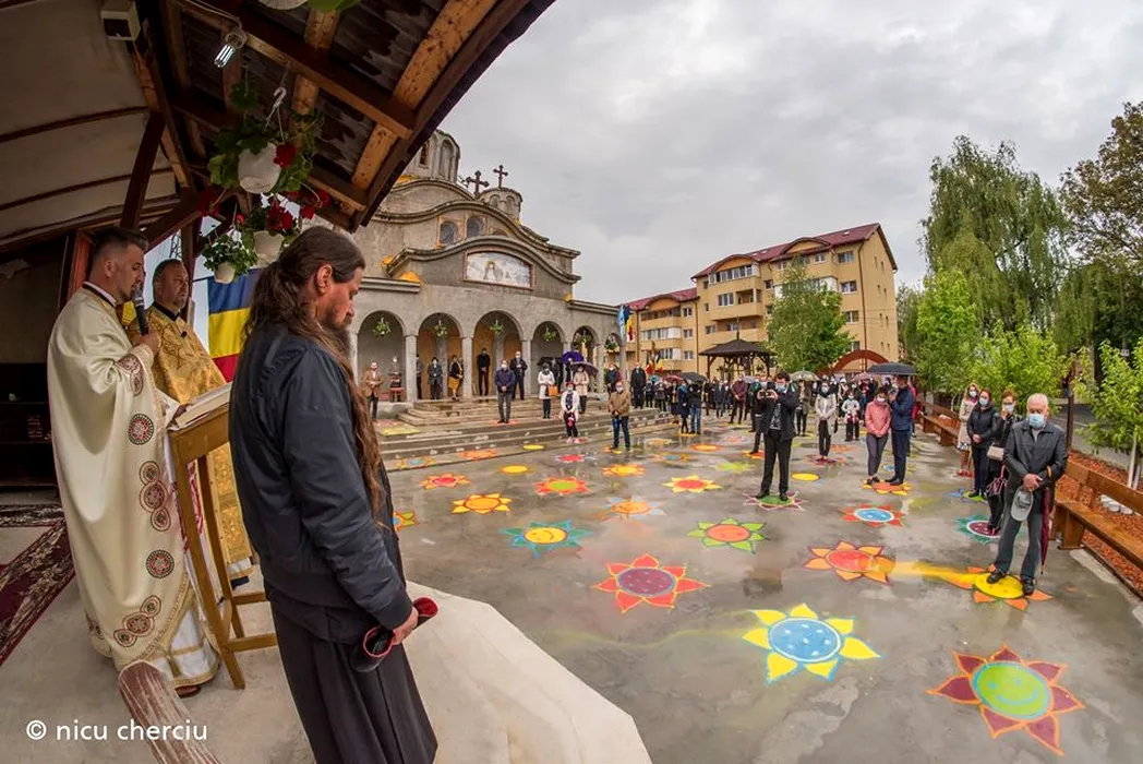 Soluția găsită de un preot din Cluj pentru ca toți cei care vin la biserică să respecte distanțarea socială. 150 de flori desenate pe asfalt alături de voluntari: „Așa cum spunea Constantin Noica, noi trebuie să trăim ca albinele pe pământ, nu ca muștele” / Sursă FOTO: Nicu Cherciu - Facebook