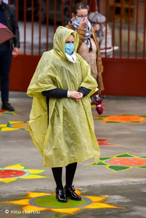 Soluția găsită de un preot din Cluj pentru ca toți cei care vin la biserică să respecte distanțarea socială. 150 de flori desenate pe asfalt alături de voluntari: „Așa cum spunea Constantin Noica, noi trebuie să trăim ca albinele pe pământ, nu ca muștele” / Sursă FOTO: Nicu Cherciu - Facebook