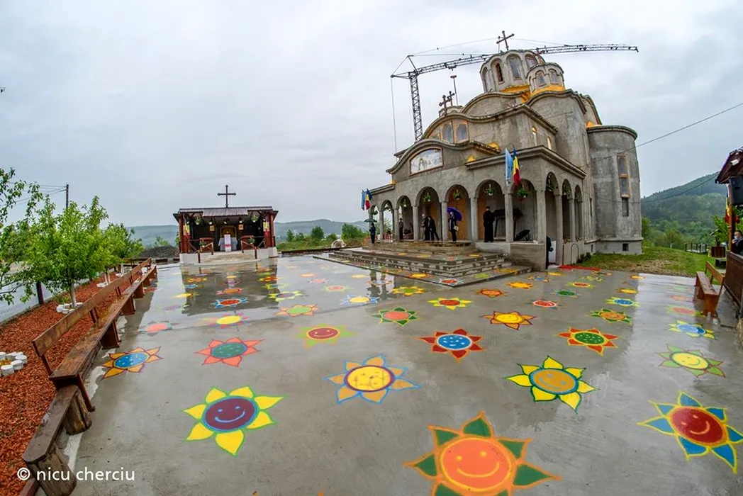 Soluția găsită de un preot din Cluj pentru ca toți cei care vin la biserică să respecte distanțarea socială. 150 de flori desenate pe asfalt alături de voluntari: „Așa cum spunea Constantin Noica, noi trebuie să trăim ca albinele pe pământ, nu ca muștele” / Sursă FOTO: Nicu Cherciu - Facebook