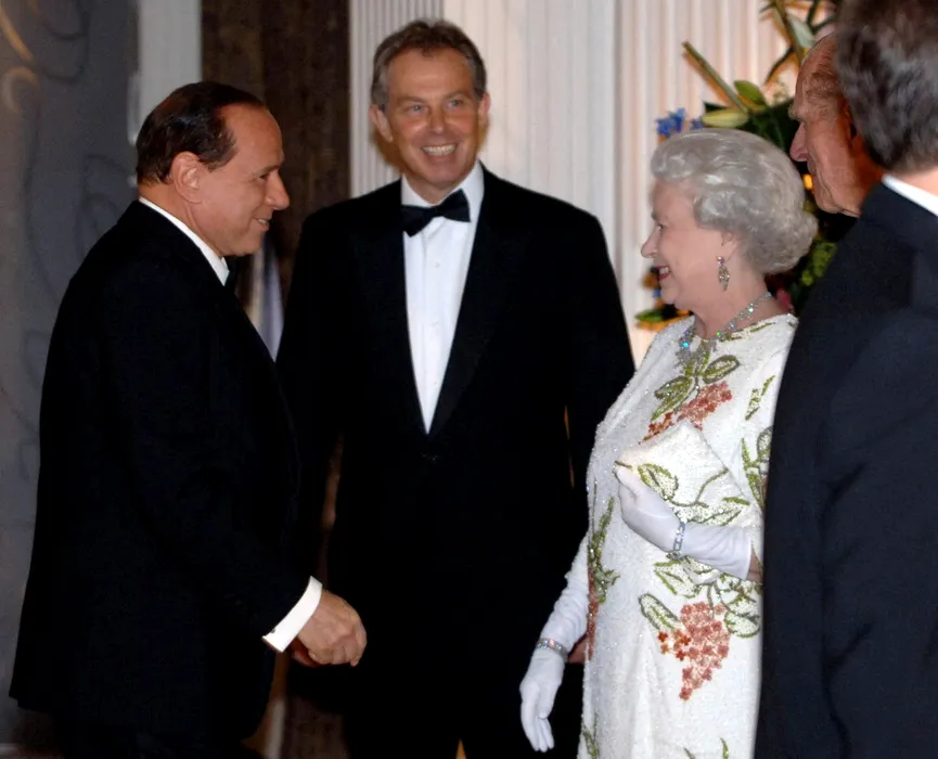 Regina Elisabeta a II-a a Marii Britanii îl salută pe Silvio Berlusconi în timp ce prim-ministrul britanic Tony Blair (C) îl privește înainte de a găzdui o cină cu liderii G8 la Gleneagles, 06 iulie 2005/ Sursa: Profimedia