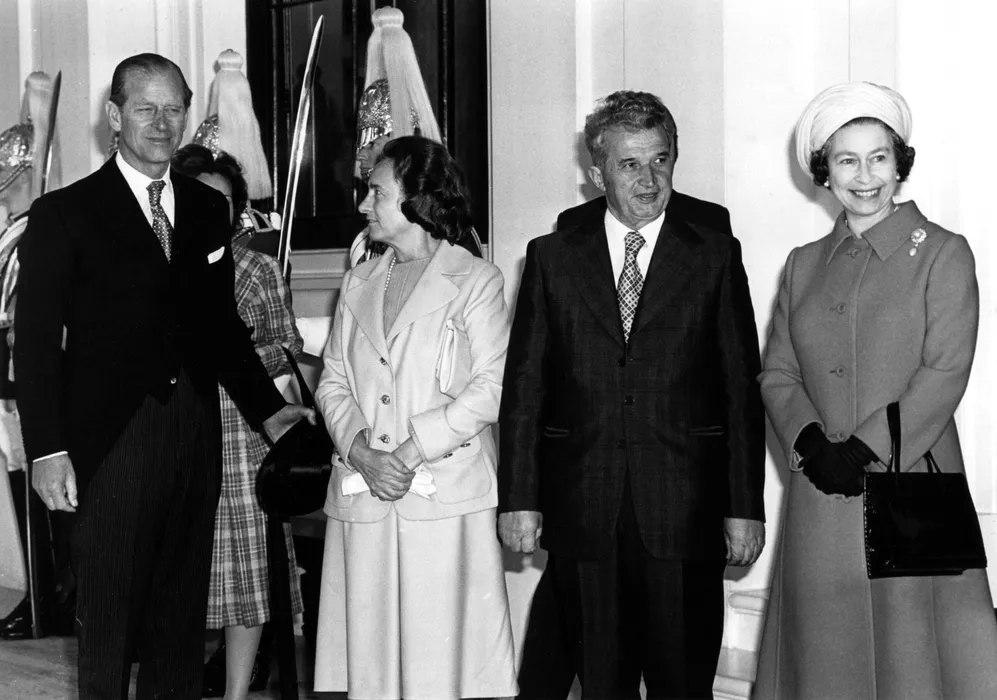 Regina Elisabeta a II-a și Prințul Filip- Ducele de Edinburgh îi salută pe președintele României Nicolae Ceaușescu și soția Elena la Palatul Buckingham din Londra