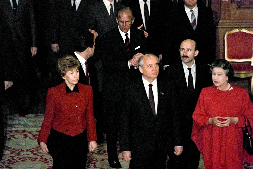Liderul sovietic Mihail Gorbaciov și soția sa Raisa Gorbaciov cu Regina Elisabeta a II-a a Marii Britanii și soțul ei Filip de Edinburgh la castelul Windsor pe 7 aprilie 1989, la sfârșitul vizitei oficiale a lui Gorbaciov in Marea Britanie.