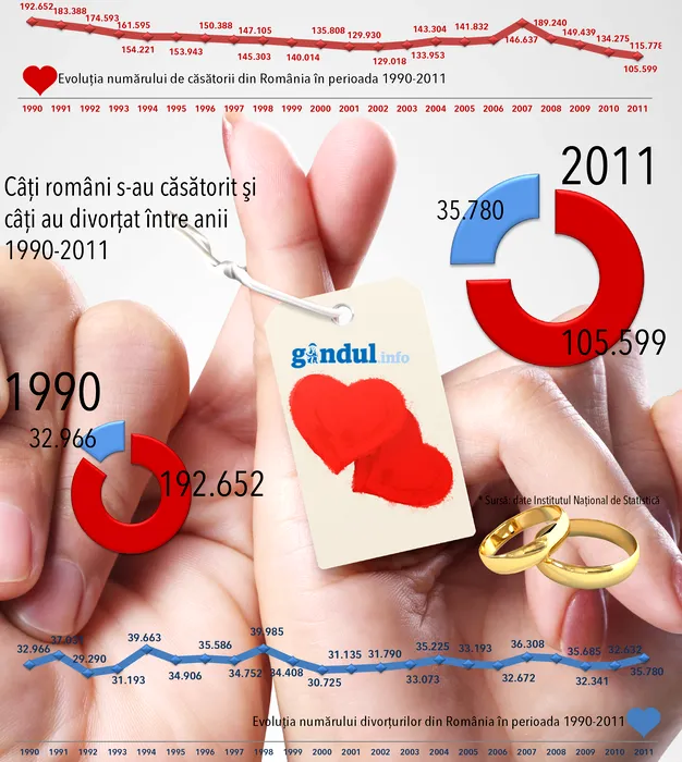 Infograficul zilei. Câți români s-au căsătorit și câți au divorțat în ultimii 22 de ani