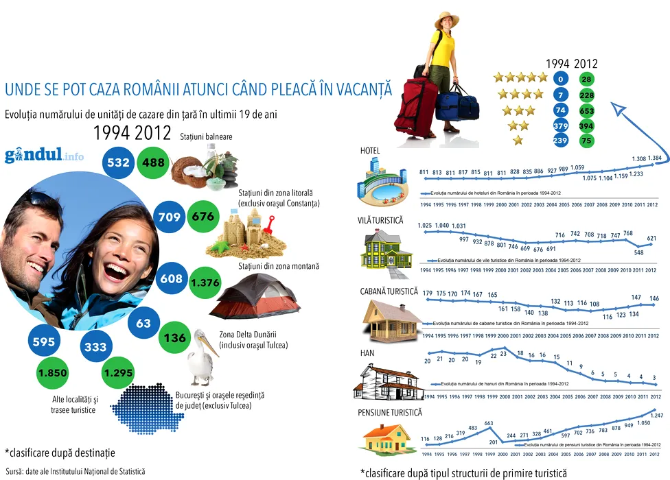 Infograficul zilei. Unde se pot caza românii atunci când pleacă în vacanță. 3.000 de noi hoteluri, pensiuni sau vile deschise în țară în ultimii 19 ani
