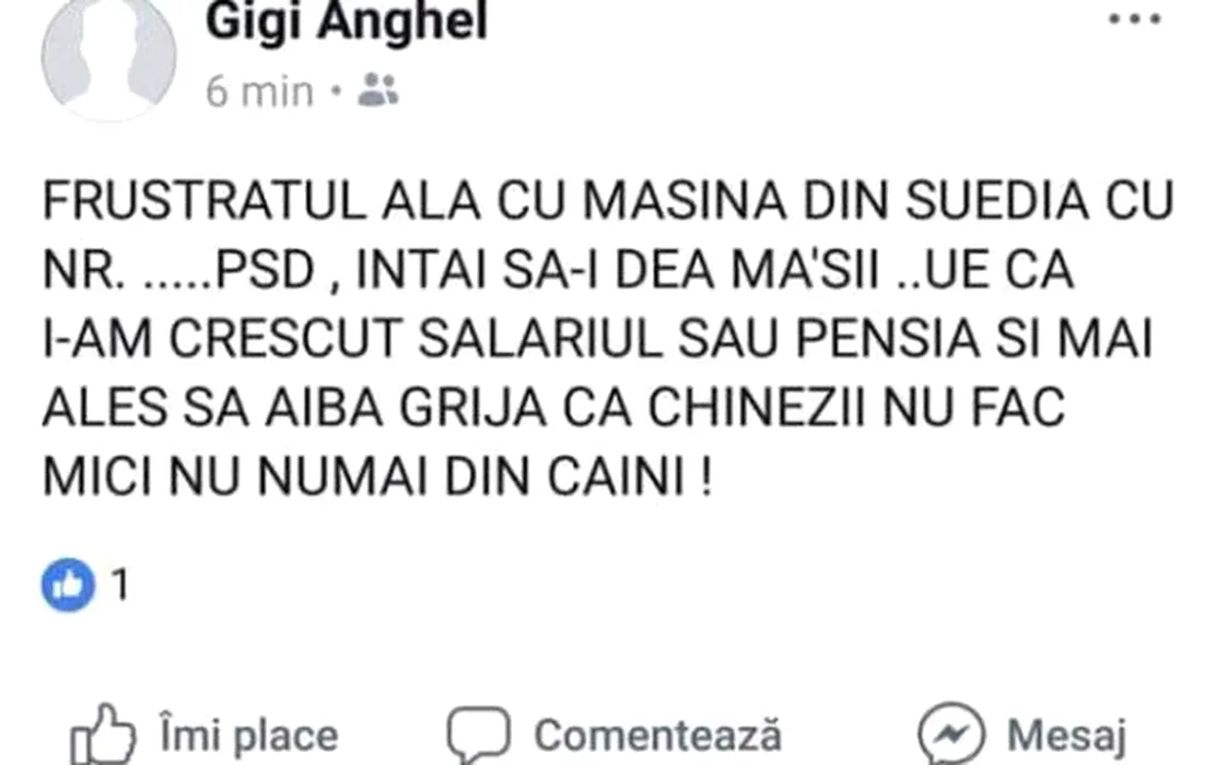 Întâi să-i dea mă-sii! Chinezii nu fac MICI doar din CÂINI! Un viceprimar social-democrat îl amenință pe șoferul M..EPSD. Mesajul vulgar a fost șters prea târziu