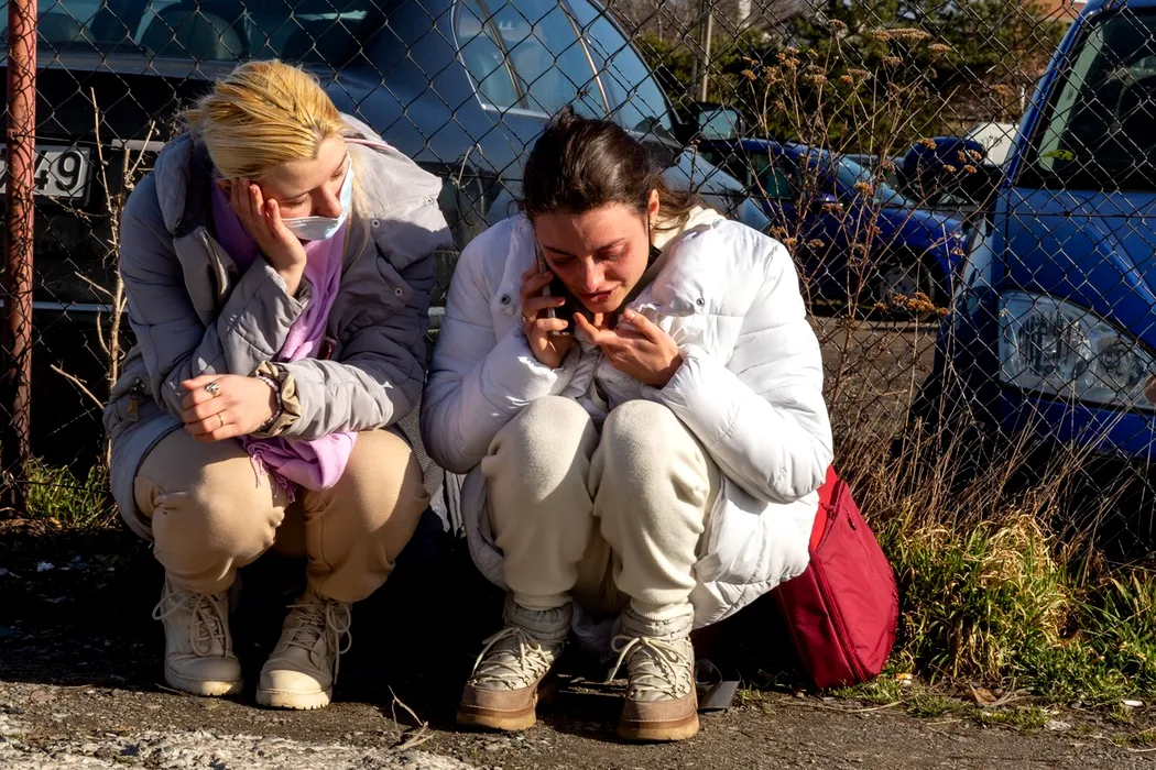 Woman cry after they entered Poland from Ukraine at Polish-Ukrainian border crossing after Russia bombarded Ukrainian territory - Medyka, Poland on February 24, 2022. As the Russian Federation army crossed Ukrainian borders the conflict between Ukraine and Russian is expected to create a wave of Ukrainian refugees of which most will seek asylum in Poland.