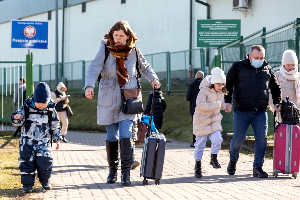 First migrants from Ukraine enter Poland after Russia bombarded Ukrainian territory - Polish-Ukrainian border crossing in Medyka, Poland on February 24, 2022. As the Russian Federation army crossed Ukrainian borders the conflict between Ukraine and Russian is expected to create a wave of Ukrainian refugees of which most will seek asylum in Poland.